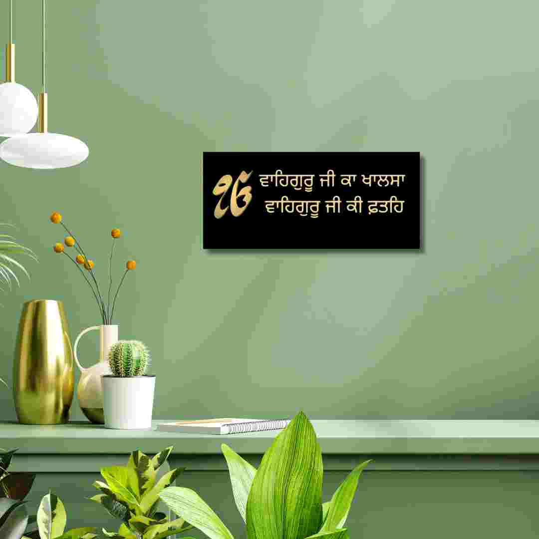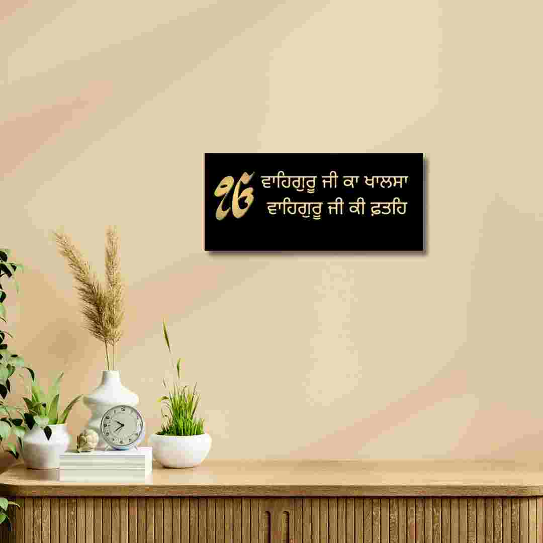 Bring divine grace and spiritual strength into your space with this beautifully designed Waheguru Ji Ka Khalsa wall decor in authentic Punjabi font. Crafted in a rich golden finish on a bold black base, this piece reflects faith, purity, and a deep connection to Sikh values.